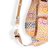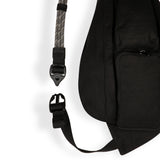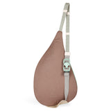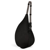Mini sling pack with adjustable rope shoulder strap and side release buckle, elastic webbing keeper at strap end, two vertical zip compartments, two key or cell phone pockets, padded back with KAVU embroidery.