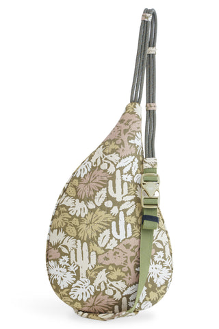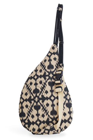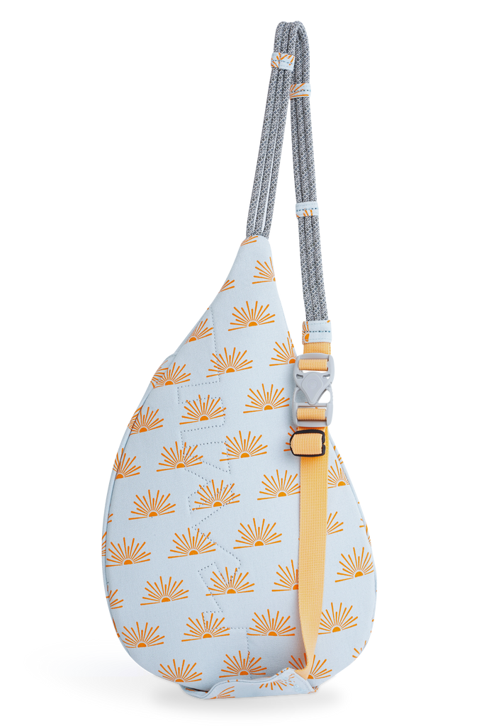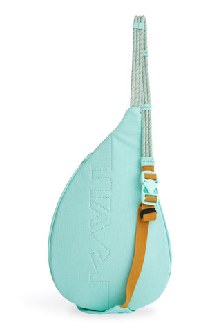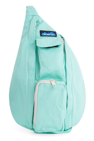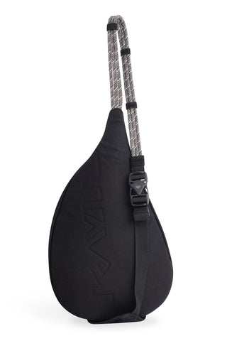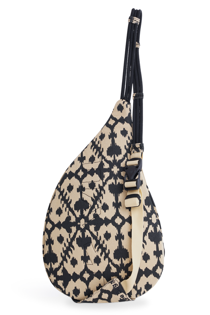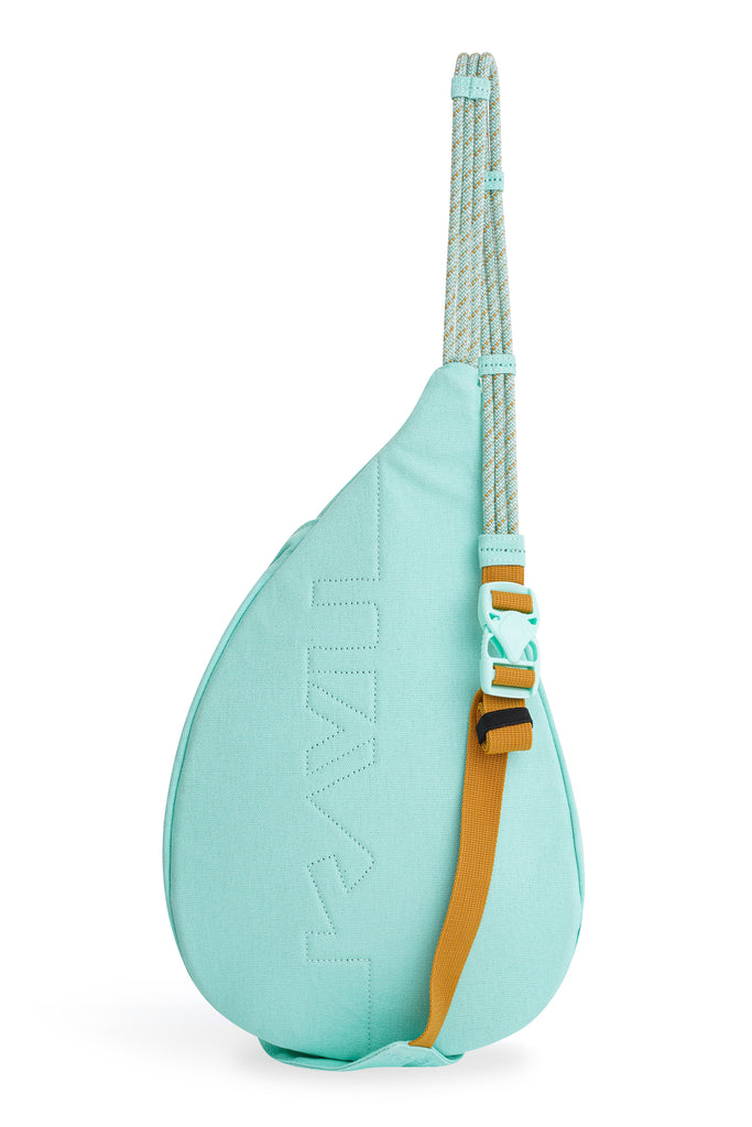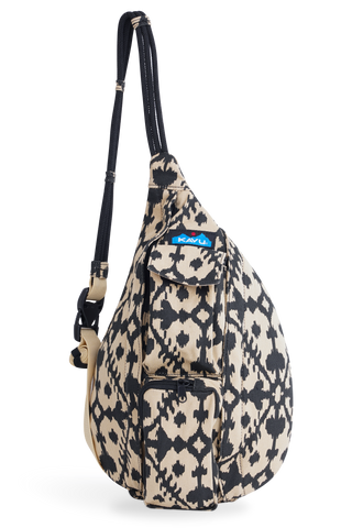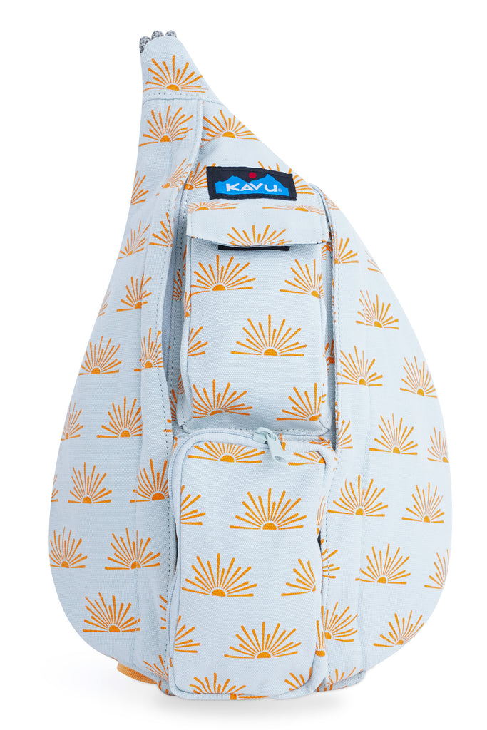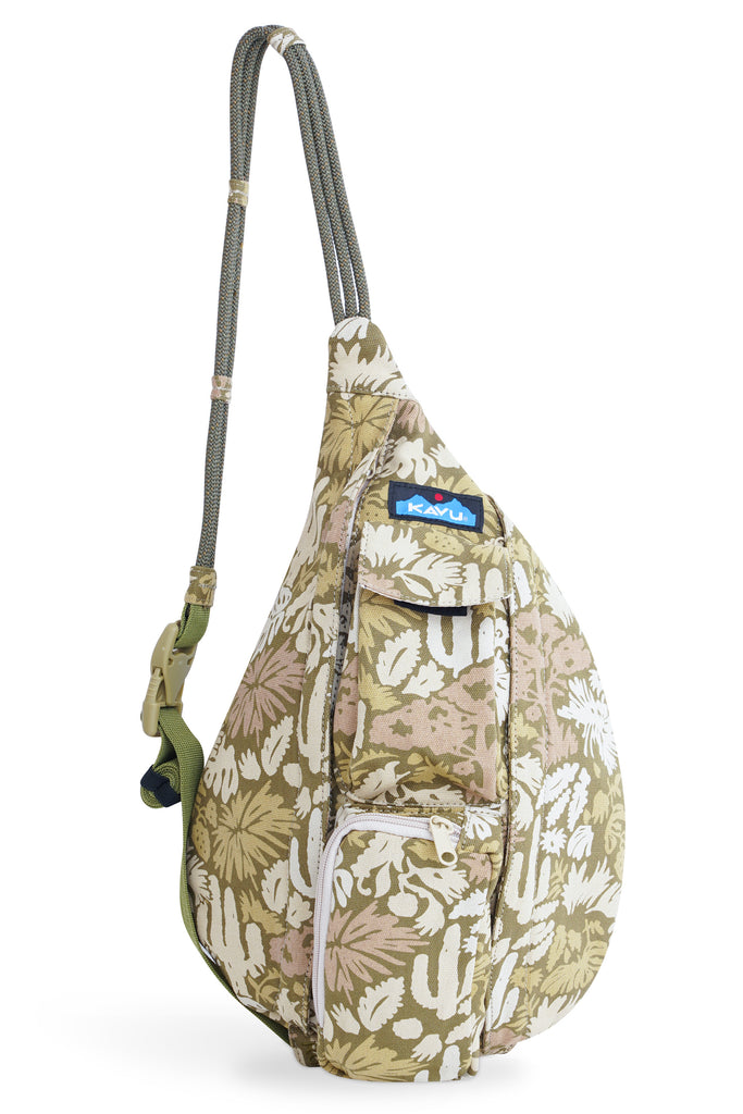 Mini sling pack with adjustable rope shoulder strap and side release buckle, elastic webbing keeper at strap end, two vertical zip compartments, two key or cell phone pockets, padded back with KAVU embroidery.