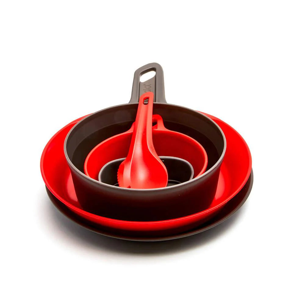 The set includes one Camper Plate DEEP and one Camper Plate FLAT, ideal for a variety of dishes. Complementing the plates are two sizes of Kåsa cups—a standard and an XL—perfect for hot or cold beverages. A Fold-A-Cup® adds extra convenience for drinks, folding flat for easy packing. For eating, supping, and cutting, a durable Spork is also included, combining multiple utensils in one lightweight tool.